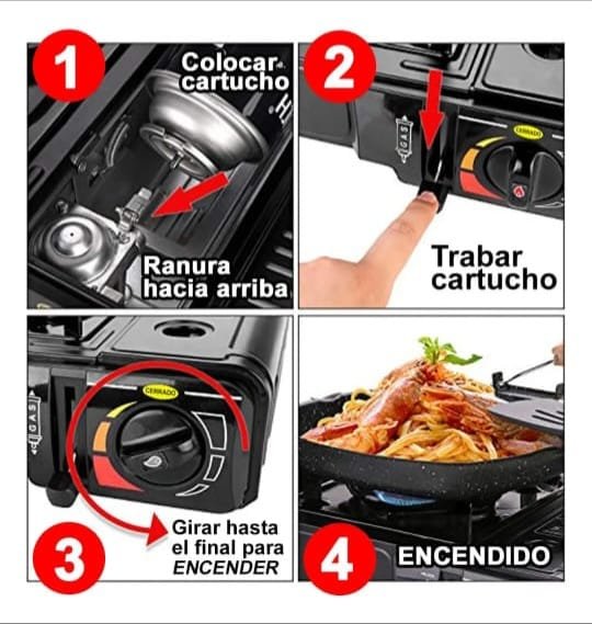 Anafe a gas butano compacto y liviano, posee sistemas de seguridad como válvula de corte automático y protección contra sobre presión.