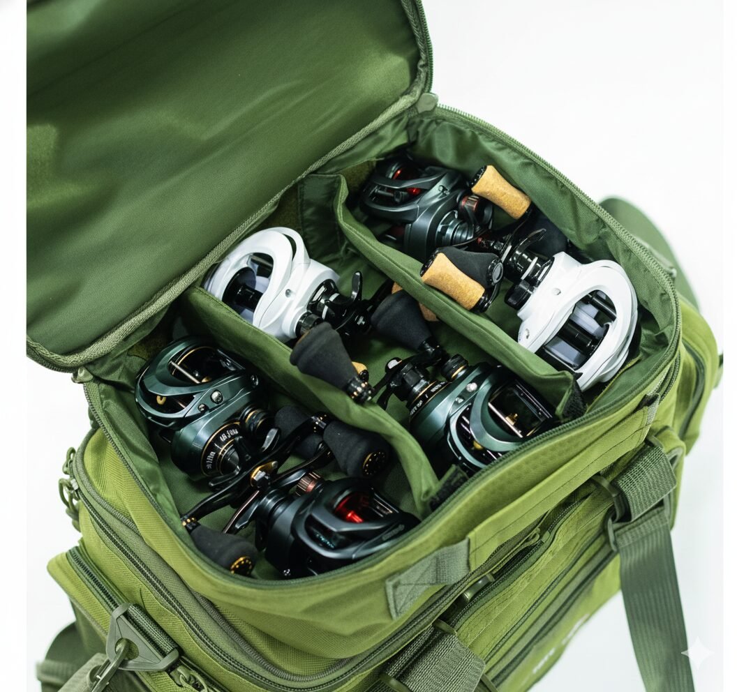 Bolso de calidad premium que cuenta con un compartimento desmontable con capacidad para transportar hasta 6 reeles de forma segura. Largo 41 cm, x 25 cm x 25 cm.