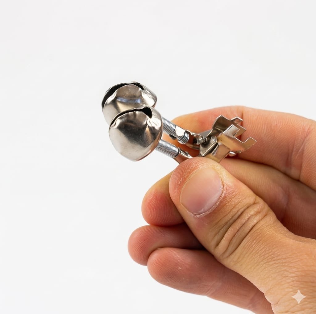 Cascabel doble con pinza. Consta de dos cascabeles metálicos montados sobre resortes flexibles, lo que maximiza la vibración