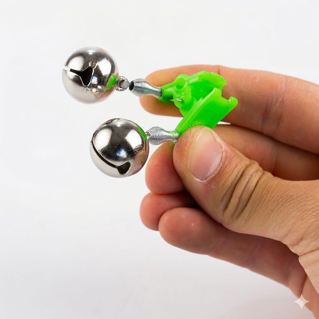 Cascabel doble metálicos sobre una pinza de plástico color verde que se engancha fácilmente a la punta de la caña de pescar.