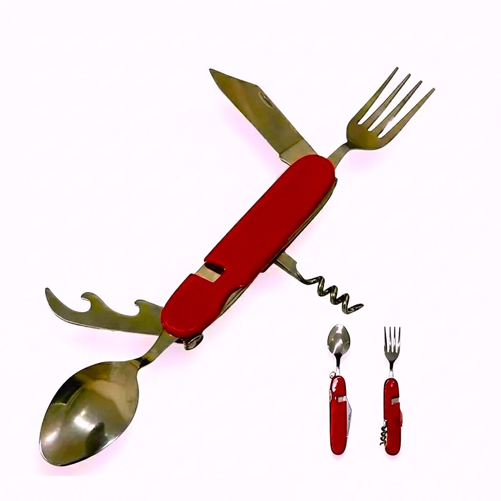 Set multifuncional para camping incluye tenedor, cuchillo, cuchara, sacacorchos y abrelatas, diseño compacto para su fácil transporte.