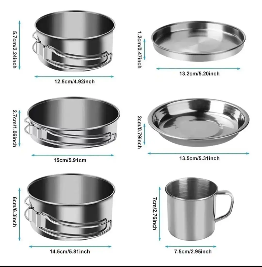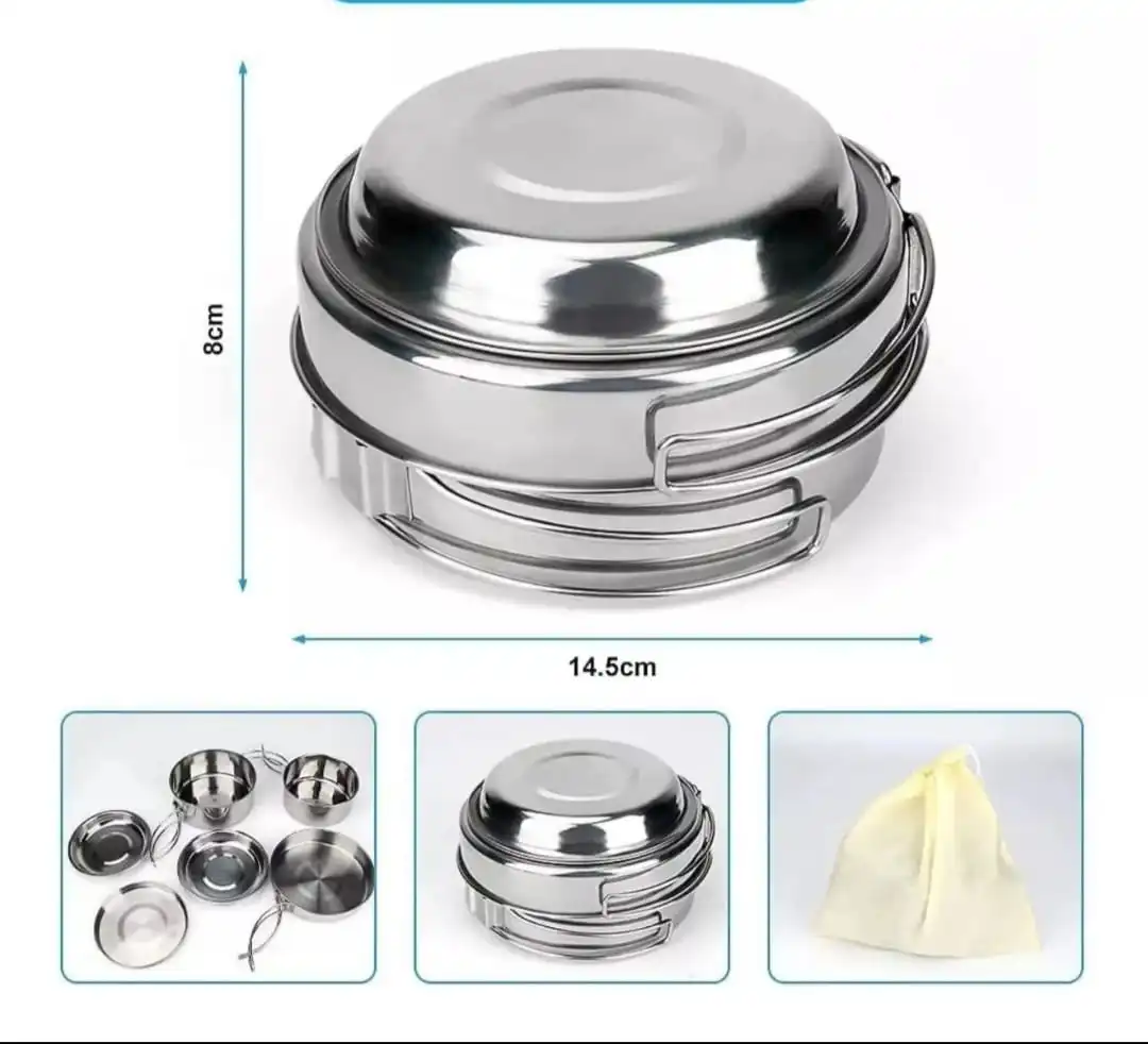 Juego de ollas y sartenes de camping de acero inoxidable.