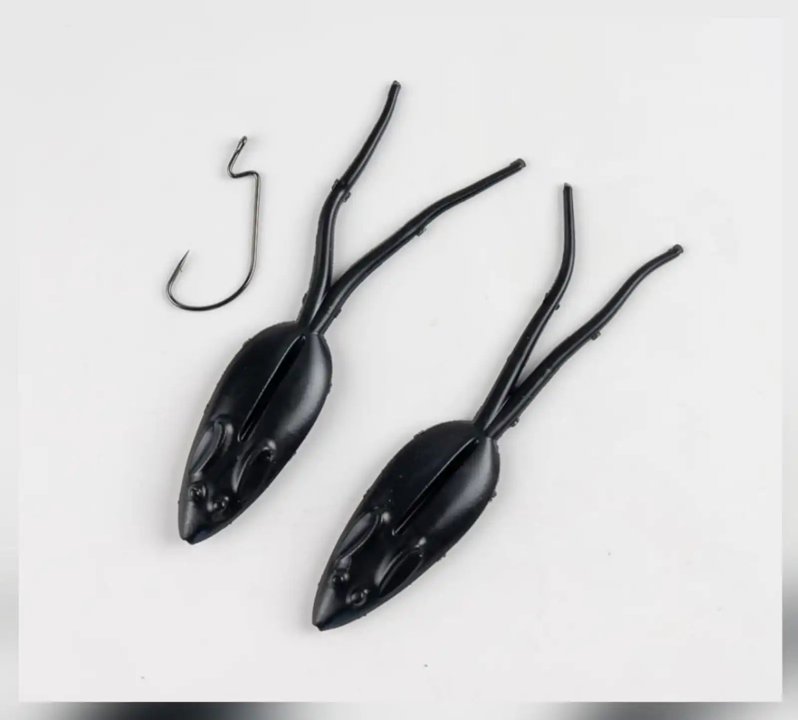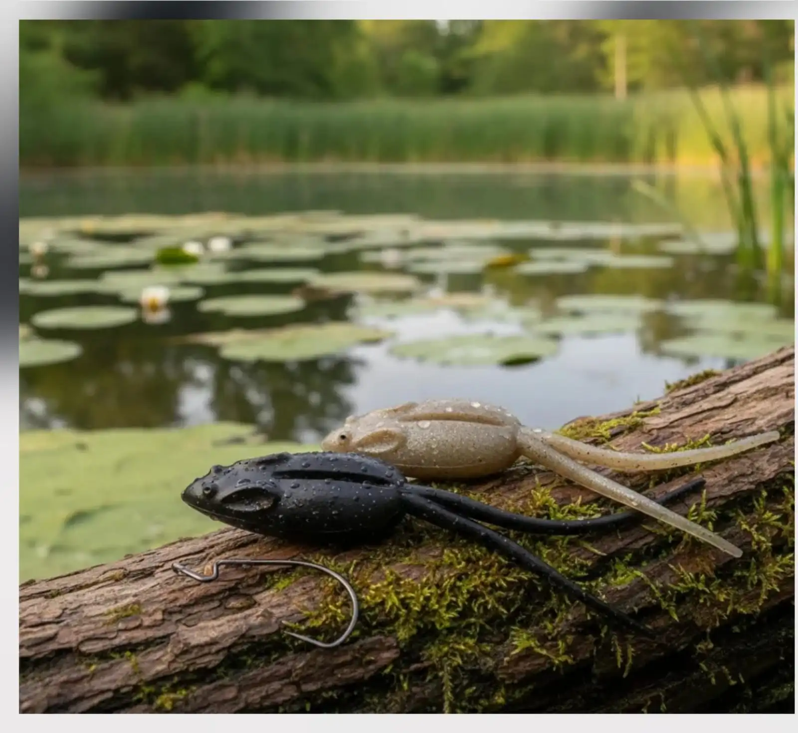 Rana señuelo artificial de pesca,de goma blanda y un anzuelo de pesca tipo weedless u offset. Están diseñados para imitar a una rana y se usan comúnmente para pescar en áreas con mucha vegetación, ya que el diseño del anzuelo ayuda a evitar enganches.